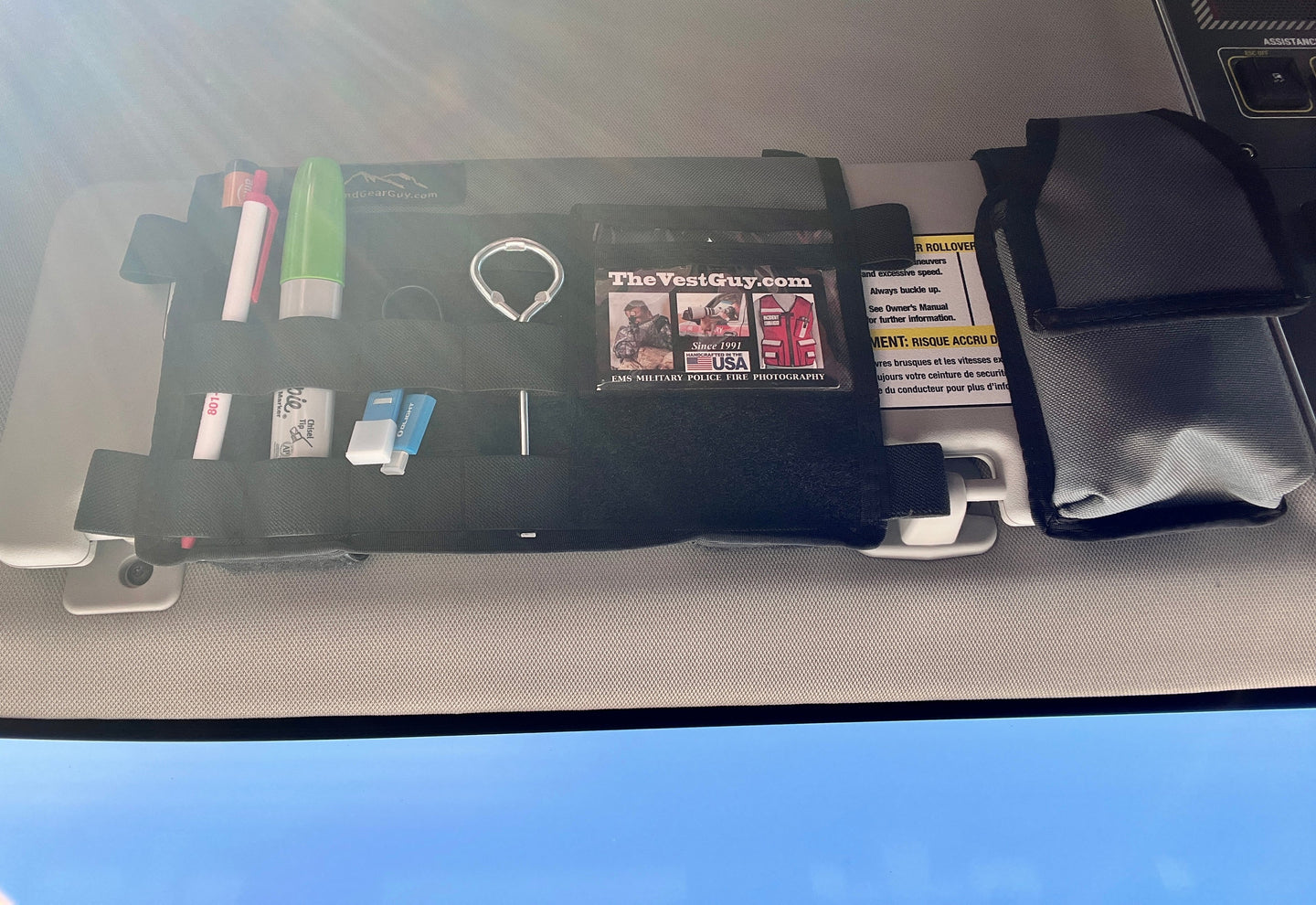 This versatile organizer attaches securely to your sun visor, providing a convenient and accessible location for your essential gear.